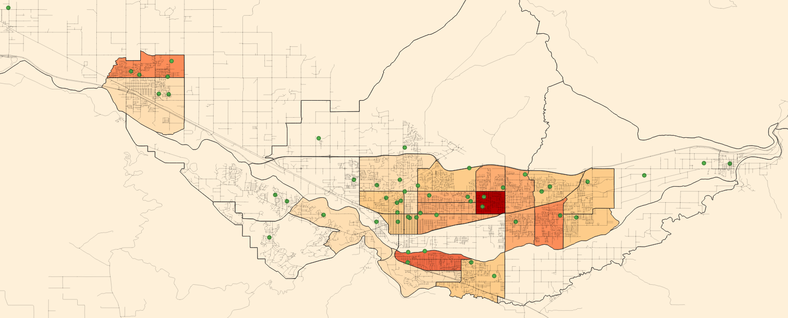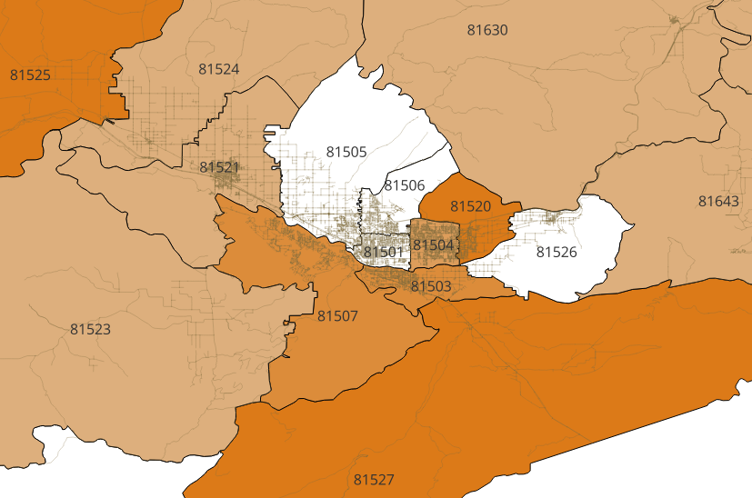Childcare Desert by Zip Code, Mesa County, April 2024. Orange areas are childcare deserts, darker orange indicates more shortage.